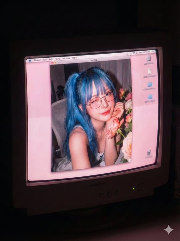 A detailed English prompt for Nano Banana Pro, based on the SDT (Stable Diffusion Template) structure, designed to generate a realistic selfie photograph of a woman displayed on a vintage CRT monitor screen, featuring specific 2000s aesthetic elements like scanlines, phosphor bloom, high digital noise, and a Mac OS X interface. The prompt requires a reference image for the character.