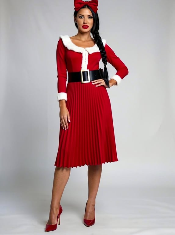 A prompt used for editing an existing image, instructing Nano Banana Pro to change a woman's outfit from a blazer/skirt to a longer, pleated Santa-inspired dress with a black belt and a large red bow instead of a Santa hat, while keeping the pose and other elements consistent.