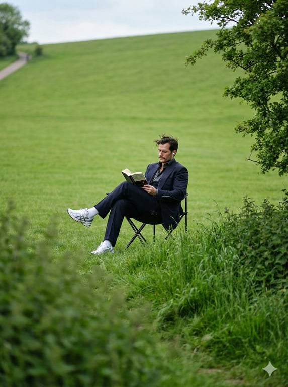 A detailed prompt for generating a long-shot photograph emphasizing peaceful solitude in a wide green landscape. It instructs the AI to maintain the subject's appearance from a reference photo while placing him on a black folding chair, reading a novel. The composition uses foreground bokeh and natural framing to highlight the contrast between the small human subject and the vast, calm environment under soft, even lighting.
