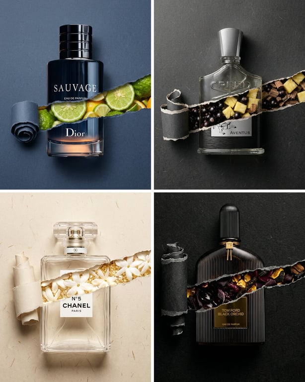 A highly specific, photorealistic prompt for a commercial product photograph of a Dior perfume bottle. The key feature is a single, continuous horizontal tear in the background paper that visually cuts through the glass bottle, revealing a dense, vibrant layer of citrus zest inside the tear channel.
