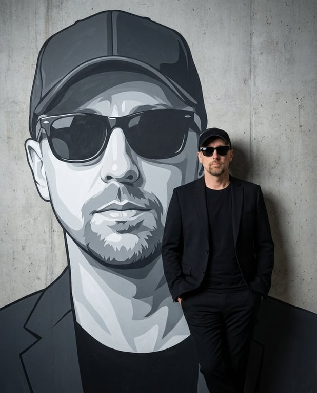 A detailed prompt for generating a high-resolution studio photograph where the subject is posing in front of a large, stylized vector-art mural of themselves. The prompt emphasizes photographic realism, controlled cinematic lighting, and a clear distinction between the real subject and the painted mural, requiring a reference image for identity preservation.