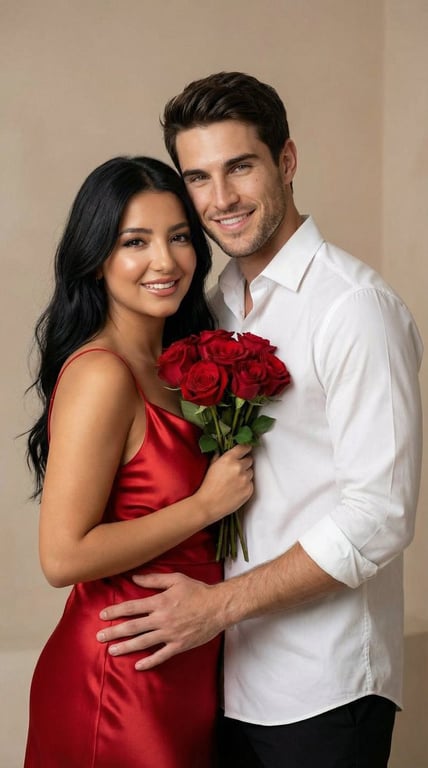 A highly structured prompt for converting a reference photo of a couple into a soft anime/illustration style, preserving their identity while depicting the woman in a red satin dress holding red roses, suitable for an elegant poster look.