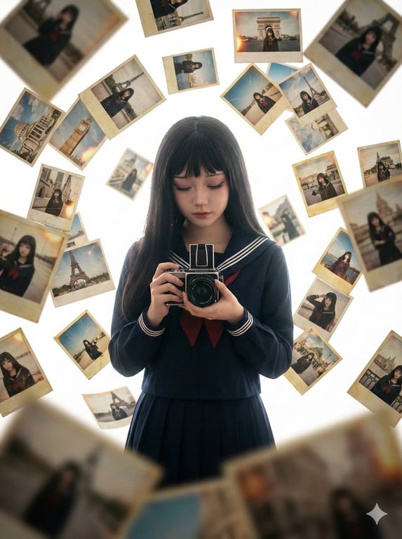 A detailed, photorealistic image generation prompt in JSON format for Nano Banana Pro, focusing on a young Asian girl holding a vintage film camera, surrounded by swirling, self-portrait photos that look like aged Polaroid prints. The prompt emphasizes cinematic lighting, surreal aesthetics, and a pure white background.