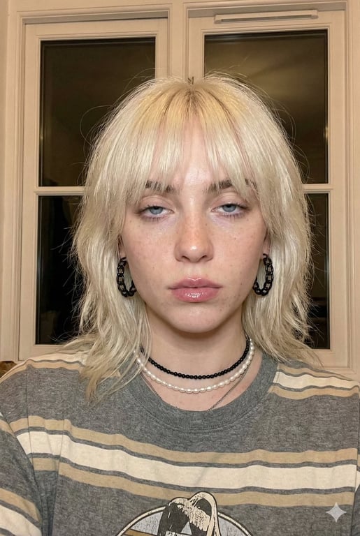 A highly detailed, structured JSON prompt for generating a vertical, photorealistic 4K selfie portrait in the style of Billie Eilish's 2021 blonde era. The prompt specifies her appearance (platinum blonde shag, heavy-lidded eyes, natural skin texture), layered accessories (pearl and chain necklaces, black chain-link hoops), striped t-shirt, and the setting (indoor, warm lighting, window background at night) to mimic an authentic smartphone front camera photo.