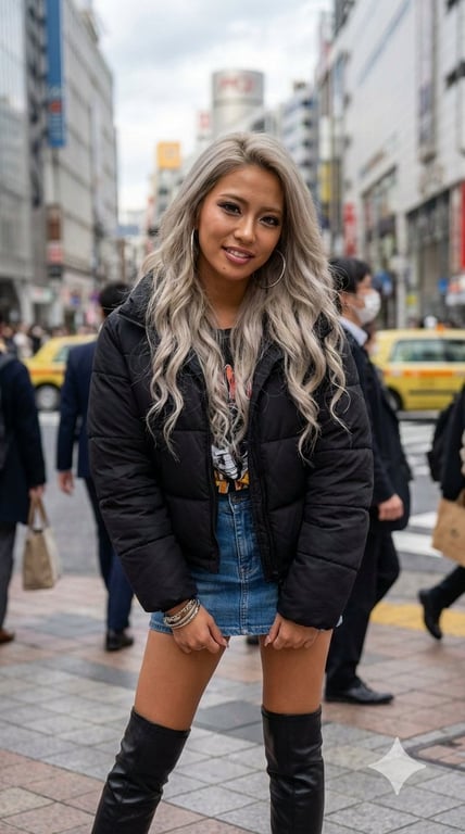 A highly detailed, photorealistic prompt for generating a vertical portrait of a young Japanese woman (gyaru style) with strong Heisei influence, set against the Shibuya crossing during the daytime. The prompt specifies appearance details, outfit (trendy winter street fashion), camera settings (50mm lens, shallow depth of field), and negative prompts.