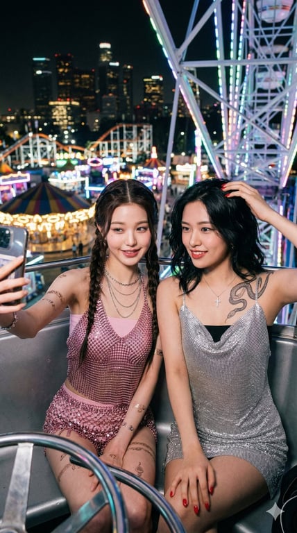 A detailed, structured prompt for Nano Banana 2 generating a photorealistic night selfie of two young women on a Ferris wheel, specifying their appearance (chainmail outfits, tattoos), the vibrant amusement park setting, and cinematic night photography parameters.