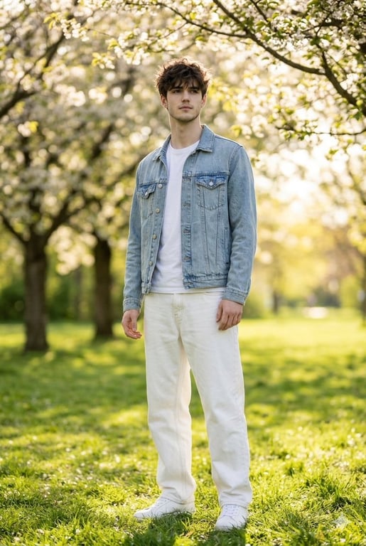 A highly structured JSON prompt designed for photorealistic image generation, detailing the scene, subject, clothing, lighting, camera specifications, and desired output quality for a portrait of a young man in a park.