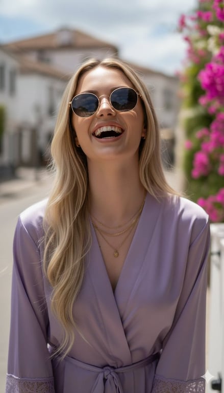 A highly detailed, photorealistic prompt for generating an image of a young woman laughing in a flowing lavender silk robe on a charming European cobblestone street, emphasizing technical specifications like 8k resolution, golden hour lighting, and a shallow depth of field.