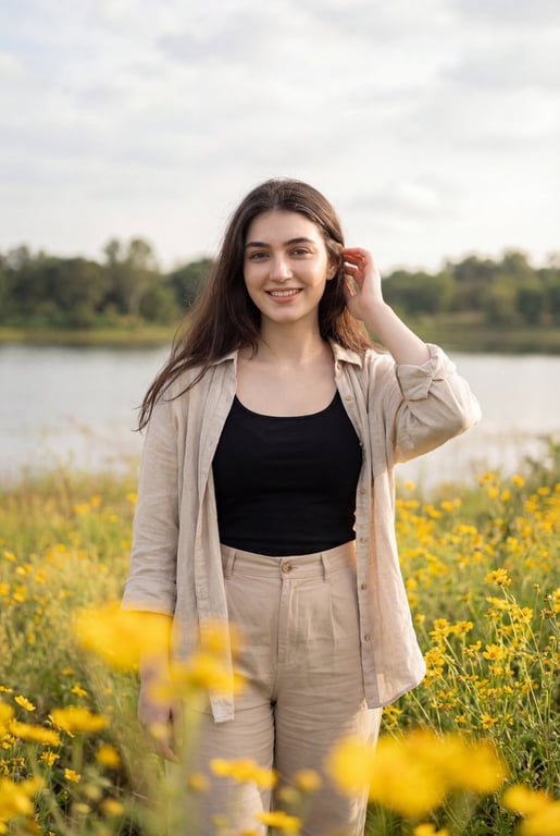 A detailed photorealistic prompt for Nano Banana Pro, generating a cinematic portrait of a smiling young woman standing in a field of yellow wildflowers, emphasizing soft natural daylight, shallow depth of field, and warm tones.