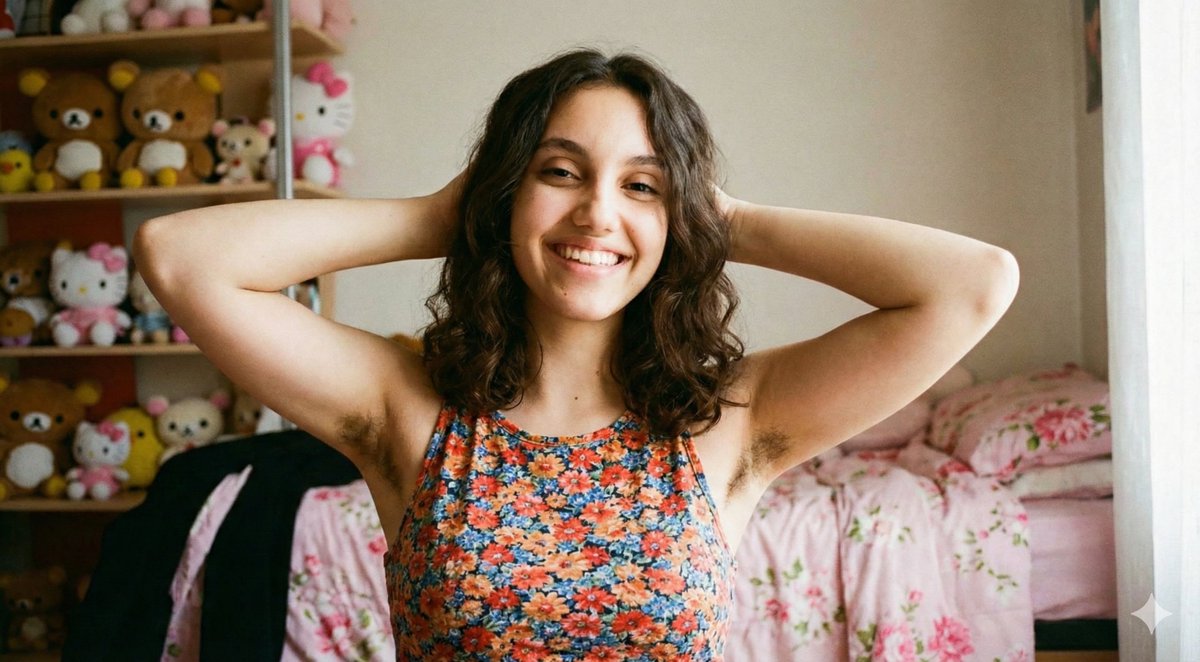 A detailed image generation prompt for Nano Banana Pro, requesting a photorealistic, cinematic portrait of a young woman with Mediterranean/Latin features, posing with her hands behind her head to expose natural, unshaven armpit hair, set in a cozy bedroom with plush toys, emphasizing body positivity and a shallow depth of field.