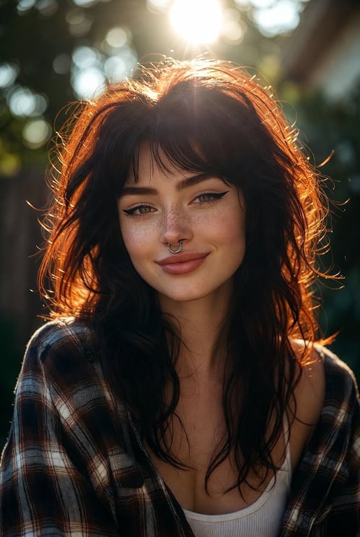 A highly detailed prompt for generating a photorealistic portrait of a young woman with voluminous, messy hair and prominent freckles. The prompt emphasizes specific lighting conditions (golden hour backlighting), technical specifications (4K Ultra HD, deep depth of field), and a casual grunge aesthetic. (This is a duplicate of 2017630814599872867).