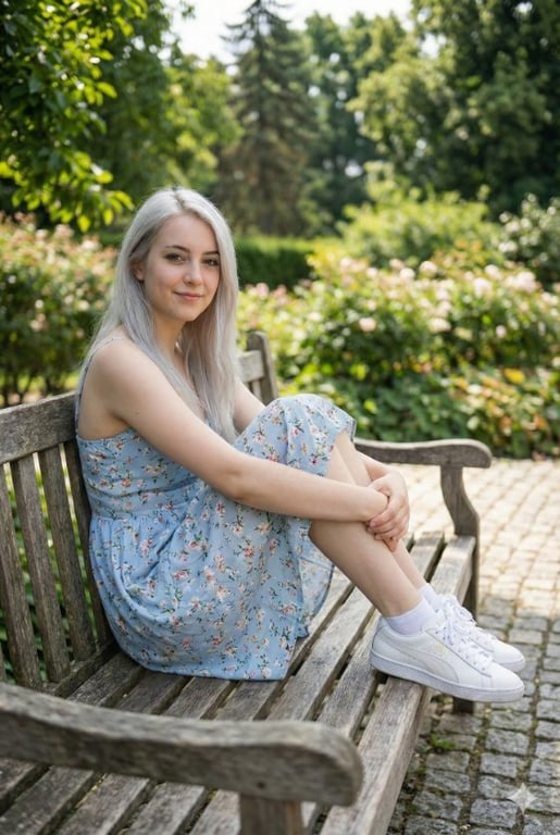 A structured prompt for generating a photorealistic lifestyle image of a young woman seated comfortably in a peaceful garden park, emphasizing natural lighting, soft colors, and a shallow depth of field for a calm, wholesome mood.