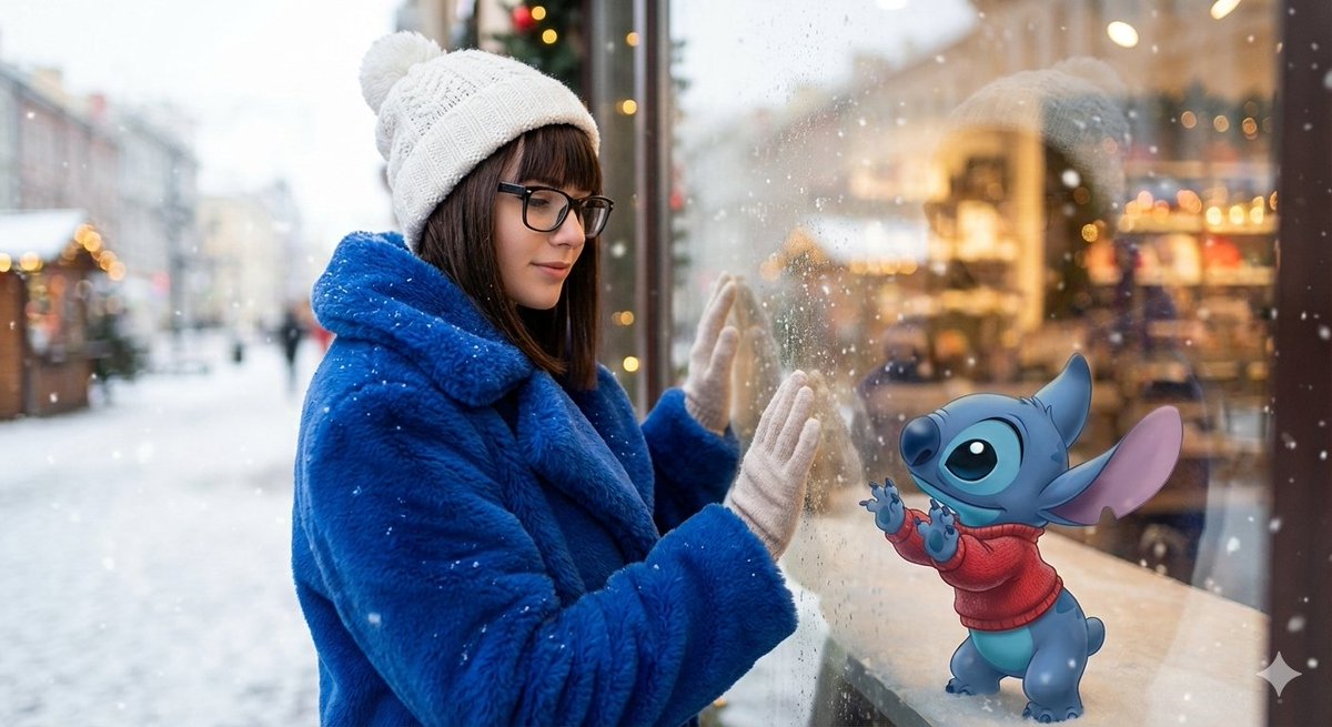 A prompt for generating an ultra-photorealistic winter outdoor portrait of a young woman interacting with a cartoonish blue creature (similar to Stitch) through a glass surface. It emphasizes cozy, festive atmosphere, detailed textures of the winter coat and beanie, and specific lighting effects (warm backlight, gentle snow).