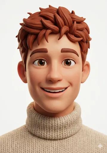 A prompt designed to generate a cute, stylized 3D character portrait in the Pixar/Disney aesthetic. It emphasizes big expressive eyes, soft smooth skin, a playful expression, cozy knitted sweater, pastel background, and technical details like cinematic lighting, 8K render, and subtle subsurface scattering.