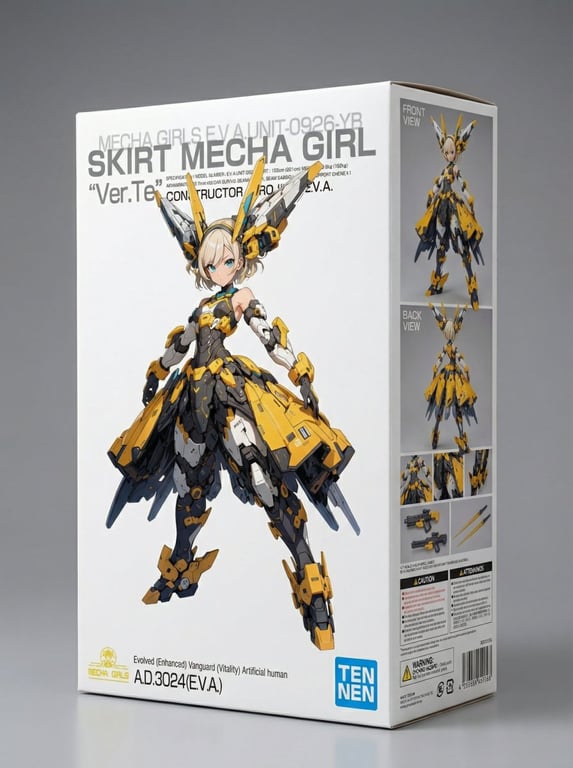 A highly structured, multi-reference image prompt for Nano Banana Pro designed to generate an image resembling a plastic model kit package. It requires three reference images (A, B, C) to be uploaded in a specific order, where A and B are placed on the side panel (often requiring front/back views) and C is used as the main artwork on the front face. The prompt is written in Japanese and includes detailed instructions on preparing the reference images.