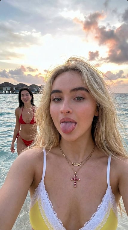 A structured JSON prompt for Nano Banana Pro to generate an ultra-realistic, playful selfie image featuring a young woman sticking her tongue out, with Dua Lipa smiling in the background, set on a Maldives beach during sunset.