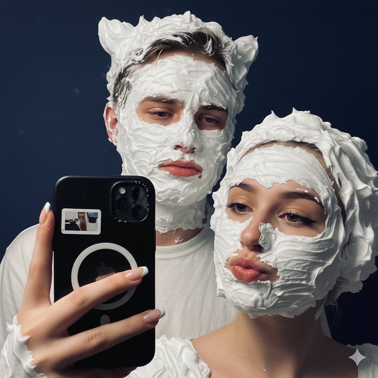 A detailed image generation prompt for Google Gemini Nano Banana Pro 3.0, aiming to create a high-contrast, playful mirror selfie of a couple covered in white shaving cream. The prompt specifies the composition, lighting (moody, low-key), and the authentic social media aesthetic, including a negative prompt list to ensure quality.