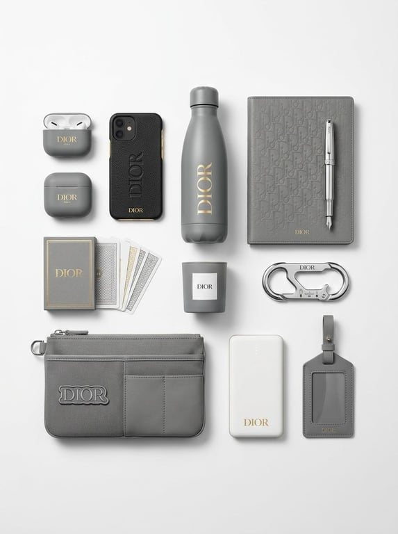 A conceptual prompt for generating an image of a premium 'capsule collection' of branded merchandise. It specifies a clean, organized knolling or isometric composition of various physical objects relevant to a brand's industry, all featuring the brand's signature color palette and bold logo integration on a seamless white studio background.