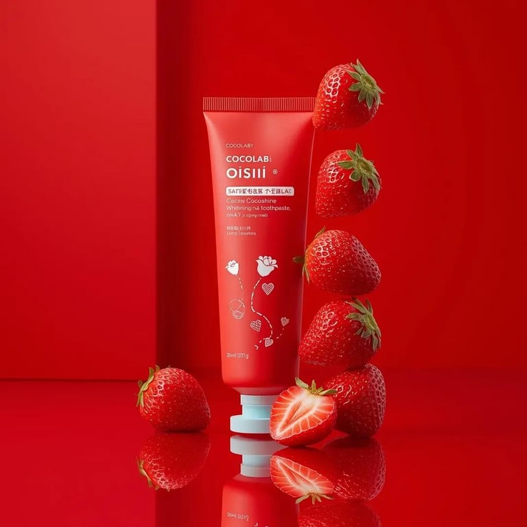 A detailed JSON prompt for generating a high-end cosmetic product advertisement featuring a glossy red toothpaste tube and fresh strawberry elements. The prompt specifies studio lighting, monochrome red environment, composition, and texture details, aiming for a fresh, modern, and premium aesthetic.