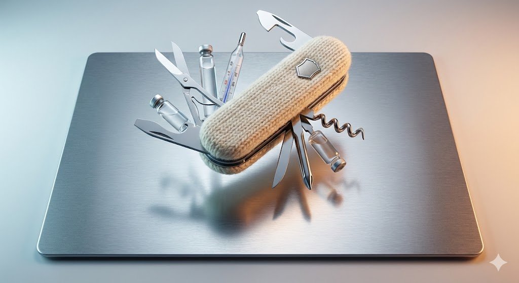 A structured JSON prompt for Nano Banana Pro (MetaGeny framework) focused on generating product photography that conveys emotion or atmosphere. It targets a Swiss Army Knife, detailing its shield emblem and folded construction. The prompt uses a 'comfort vs. clinical' tension, incorporating twists like scale mismatch and material misplacement, set against a brushed metal plate with cross lighting to highlight texture, aiming for a surreal floating composition.