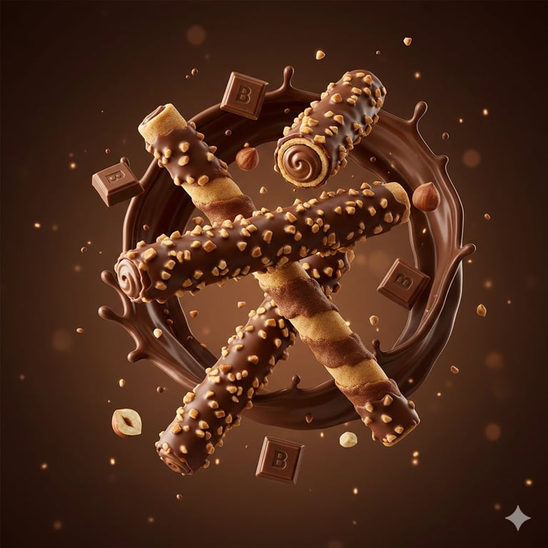 A highly structured, JSON-formatted prompt designed for generating a premium commercial food photograph of chocolate wafer rolls and hazelnuts, emphasizing zero-gravity composition, hyper-realistic textures, and dynamic fluid effects like a chocolate splash.