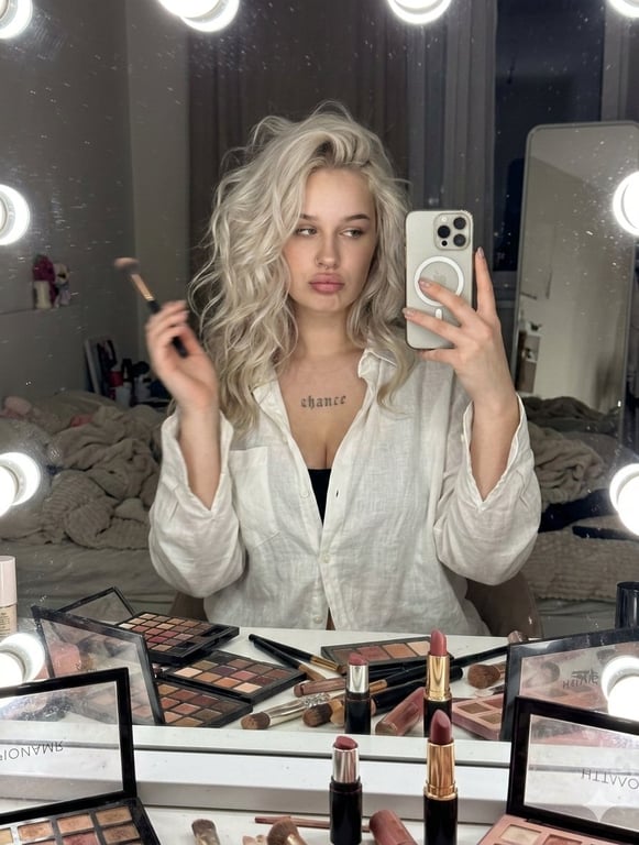 A structured prompt for Gemini Nano Banana Ai Pro to create an ultra-photorealistic, raw iPhone candid mirror selfie of a Slavic blonde woman taking a picture mid-makeup, emphasizing messy glam realism and specific character features.