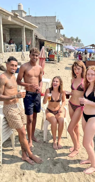 A detailed prompt for generating a realistic, candid beach photography scene featuring six young people, including specific celebrities, enjoying a sunny day. The prompt specifies setting details like local food stalls, lighting, and a documentary-style aesthetic for a travel lifestyle vibe.