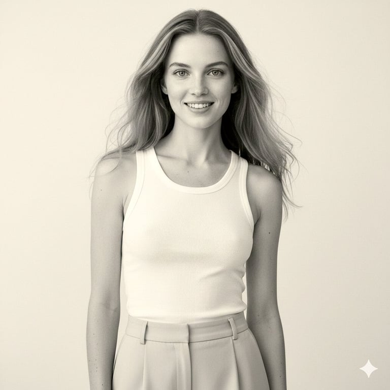 A highly detailed JSON prompt for generating a realistic black-and-white studio portrait of a young adult woman, focusing on soft lighting, vivid facial details, specific clothing (tank top and shorts), and ensuring the subject is clearly an adult.