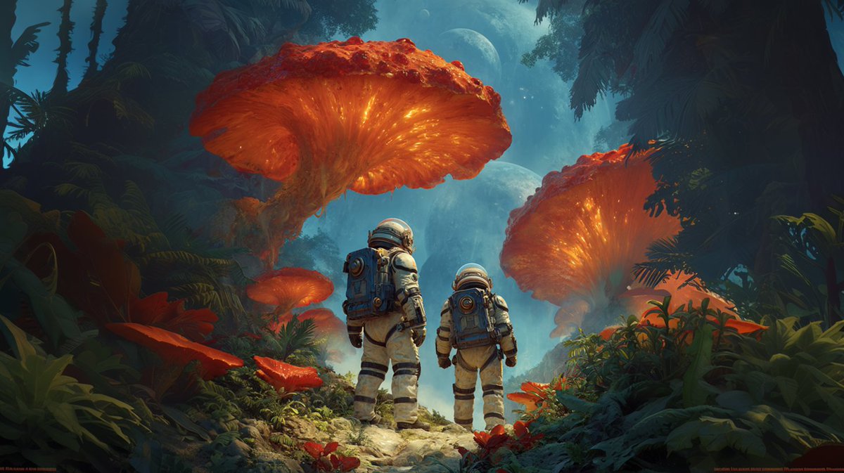 A prompt for generating a realistic behind-the-scenes photo of a typical Hollywood studio set. The scene depicts crew members filming astronauts on a physical set piece (grass and mushrooms) that blends into a matte painting backdrop, with a green screen visible in the distance.