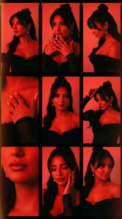 A highly structured prompt for generating a 9-panel film contact sheet collage of the same adult woman, emphasizing a moody, sensual editorial style with strong red gel lighting, heavy film grain, and specific poses for each panel, while strictly excluding text, smoking elements, and anatomical distortions.