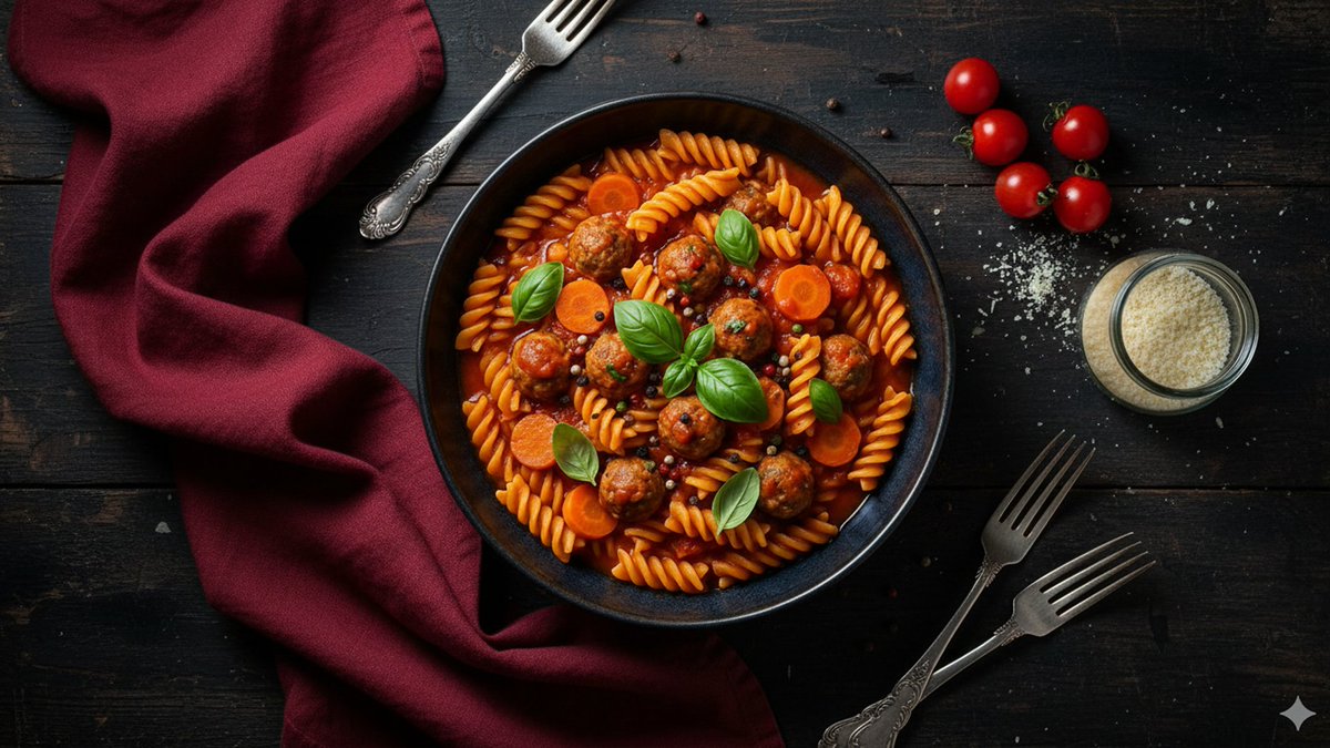 A prompt for generating a visual composition focusing on a model (whose identity is based on a reference image) seated in a modern, light-filled interior, interacting with a pasta bowl (fusilli with meatballs and basil), emphasizing the dining action and maintaining the aesthetic of the original model shot.