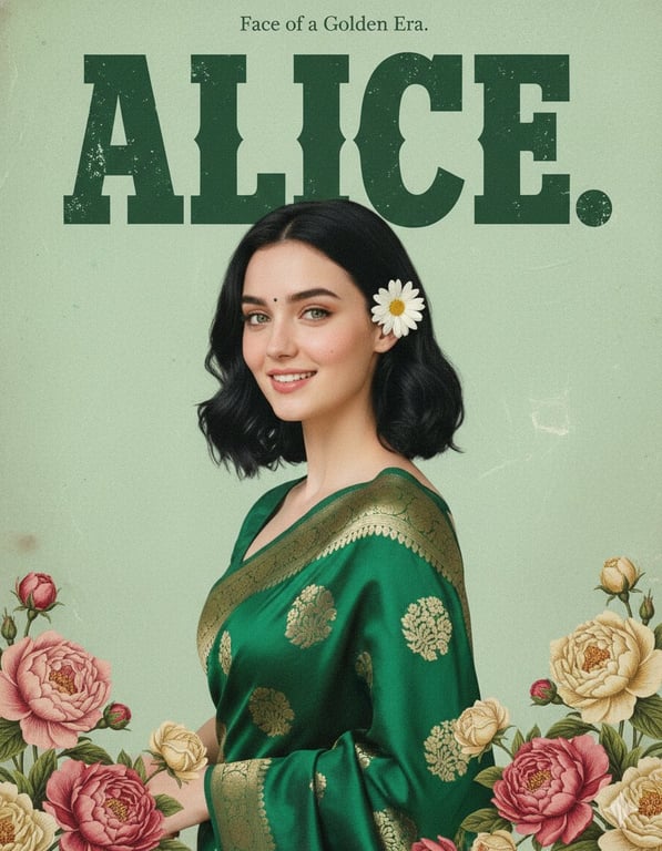 Two distinct prompts for generating personalized 'ALICE' posters: one in a retro Indian movie poster style with vintage typography, and another in a modern, hyper-realistic cinematic style with 3D golden letters.