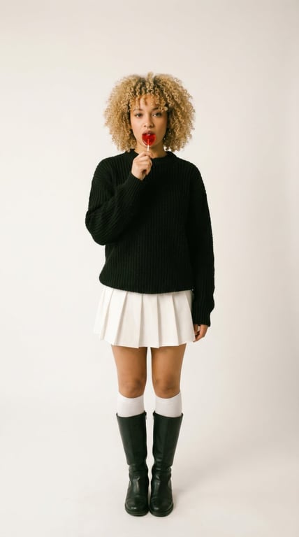 A dual-format prompt (text and JSON) for Nano Banana Pro to generate a photorealistic, full-body portrait with a retro-futuristic 1970s sci-fi aesthetic. The subject is a woman with coiled blonde hair and a nose piercing, holding a red lollipop, set in a minimalist, homogeneous white space with directional lighting.