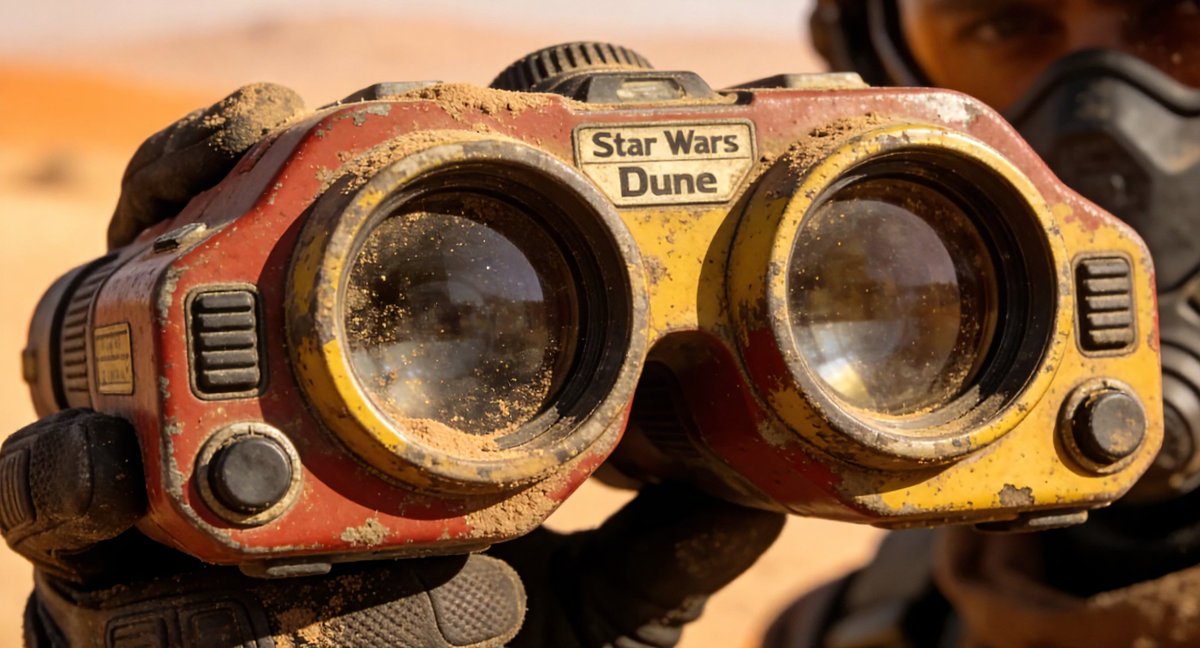A detailed prompt for generating a cinematic close-up of a weathered, retro-futuristic binocular device held by a scout in a dusty desert, emphasizing tactile details, film grain, and a 'Star Wars' or 'Dune' aesthetic.