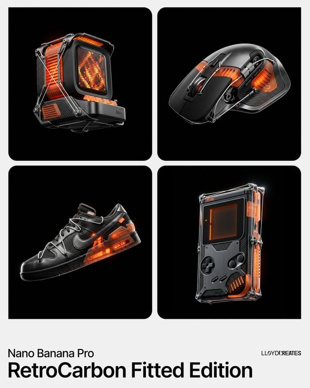 A highly technical, JSON-formatted prompt for generating a high-end product render (RetroCarbon Fitted Edition) centered and levitating in a total void. It specifies the material blend (carbon fiber, matte composite), 'Tensioned Mechanics' design, and internal neon ember/cyber tangerine glow.