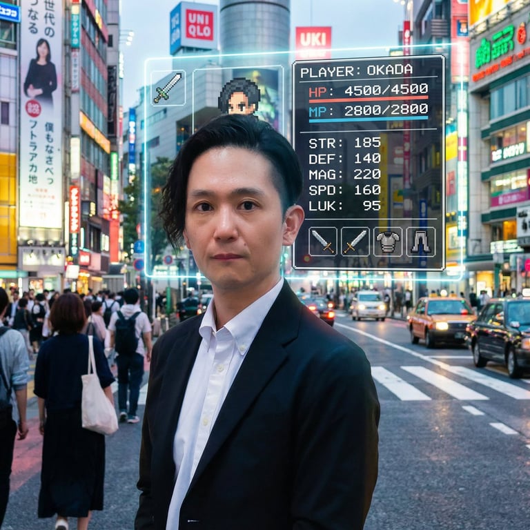 A Japanese prompt for generating an image where a realistic RPG status screen appears behind the subject.