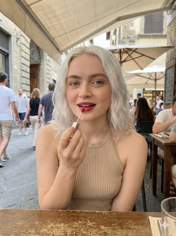 A highly detailed prompt for generating an ultra-realistic, candid portrait of Sadie Sink at an outdoor European cafe, focusing on a beauty moment where she applies red lip gloss, featuring platinum white blonde hair, fair skin, and soft diffused natural daylight.