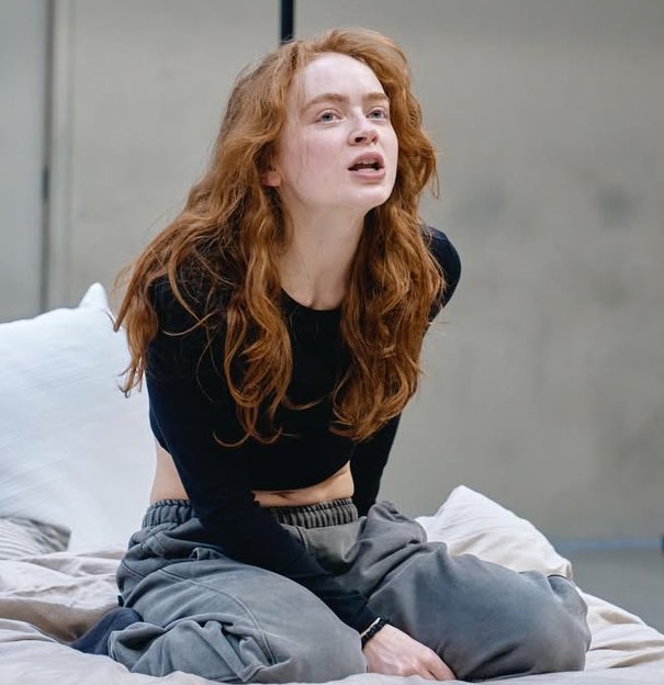 A structured JSON prompt for generating a candid lifestyle portrait of Sadie Sink (or a similar subject) sitting on a bed. It details her appearance, outfit (black crop top, grey sweatpants), pose, and the minimal indoor environment, aiming for a calm, intimate, and emotionally expressive mood.