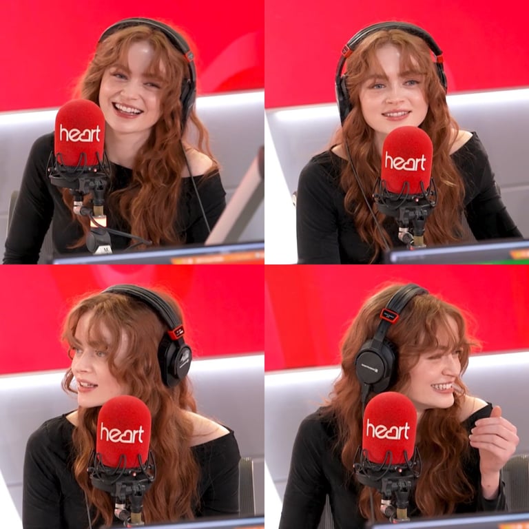 A JSON prompt for generating a vibrant studio portrait of a woman resembling Sadie Sink as a charismatic radio presenter. The scene features a bold red 'heart' branded microphone, black headphones, and a red studio background, emphasizing a modern, joyful, and confident mood.
