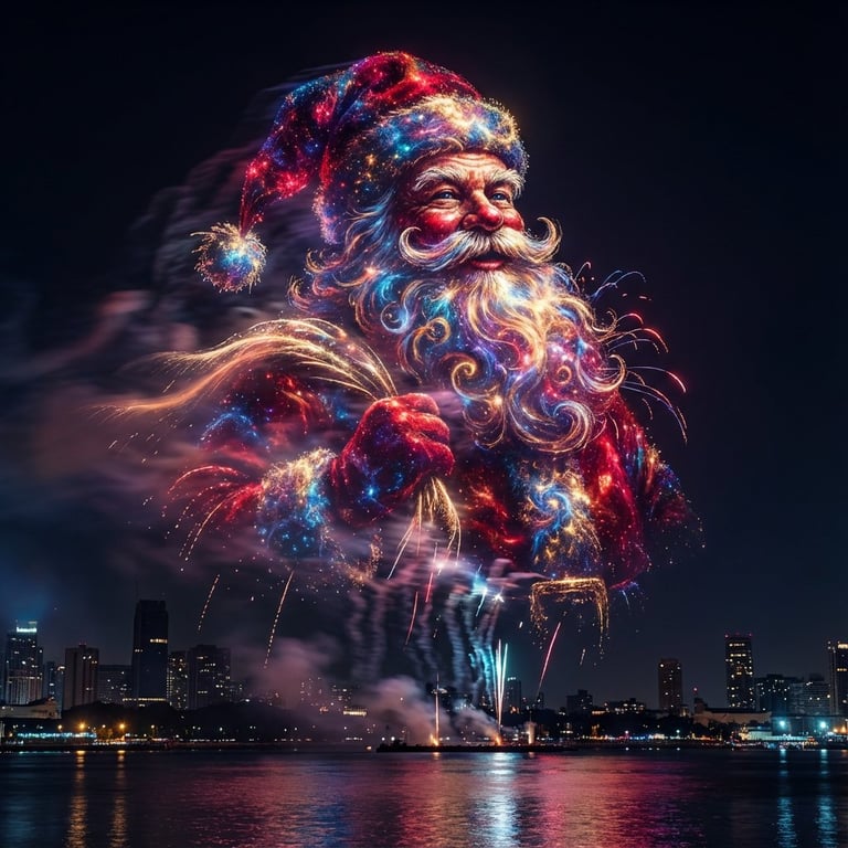 A prompt for generating a photorealistic, long-exposure image of fireworks forming the shape of Santa Claus in the night sky above a waterfront city, capturing smoke trails and reflections on the water.