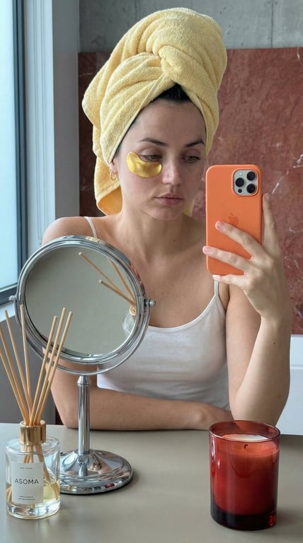 A highly structured JSON prompt for Nano Banana Pro, instructing the generation of a hyper-realistic, candid lifestyle photo in a Scandinavian Minimalist/Quiet Luxury aesthetic, featuring Ana de Armas. The prompt emphasizes identity consistency, natural skin texture, and specific details like a towel turban, a single gold hydrogel eye patch, and a round mirror in a modern loft bathroom setting.