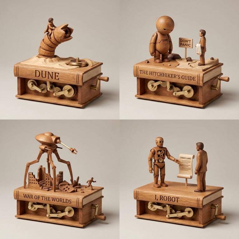 A prompt for Nano Banana Pro to generate a 2x2 grid of images featuring whittled wooden tabletop automatons. Each automaton is mounted on a book-shaped base and represents characters/elements from four random sci-fi books, driven by exposed mechanical linkages. The style is premium studio macro product photography, emphasizing crisp details, neutral softbox lighting, and a medium shallow depth of field.