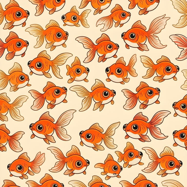 A simple prompt for generating a seamless pattern suitable for textiles or wallpaper, featuring cute, cartoonish fancy goldfish with large eyes on a cream background.