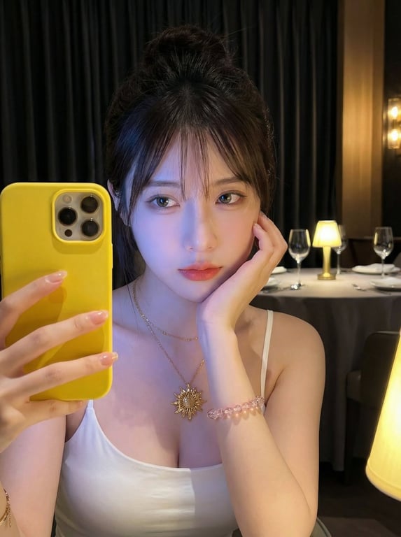 A detailed prompt for generating a vertical, close-up selfie portrait of a young Asian woman using Nano Banana Pro. The prompt emphasizes specific hair, makeup, clothing, and accessory details, focusing heavily on dramatic lighting contrastâcold blue/purple light on the subject and warm yellow tungsten light in the backgroundâto achieve a realistic, social media-style 'selfie' aesthetic.