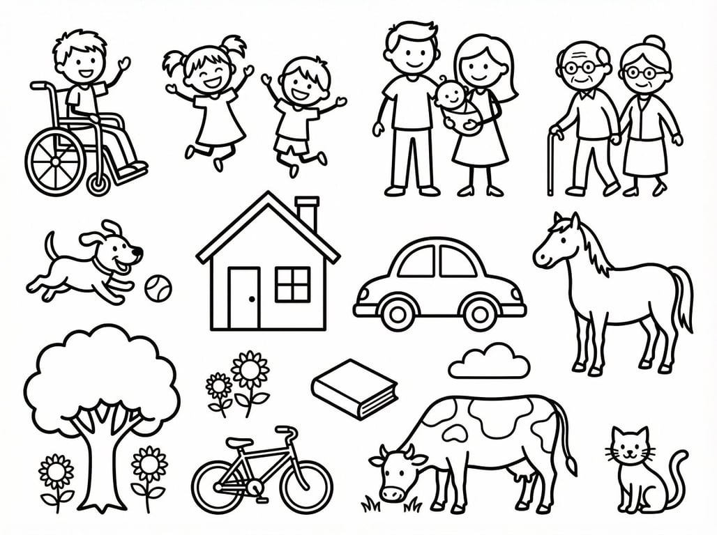 A prompt for generating high-resolution black and white line art suitable for a coloring book, featuring simple stick figure clipart of diverse people, animals (dog, horse, cow, cat), and everyday objects, emphasizing clear outlines and large open areas for coloring.