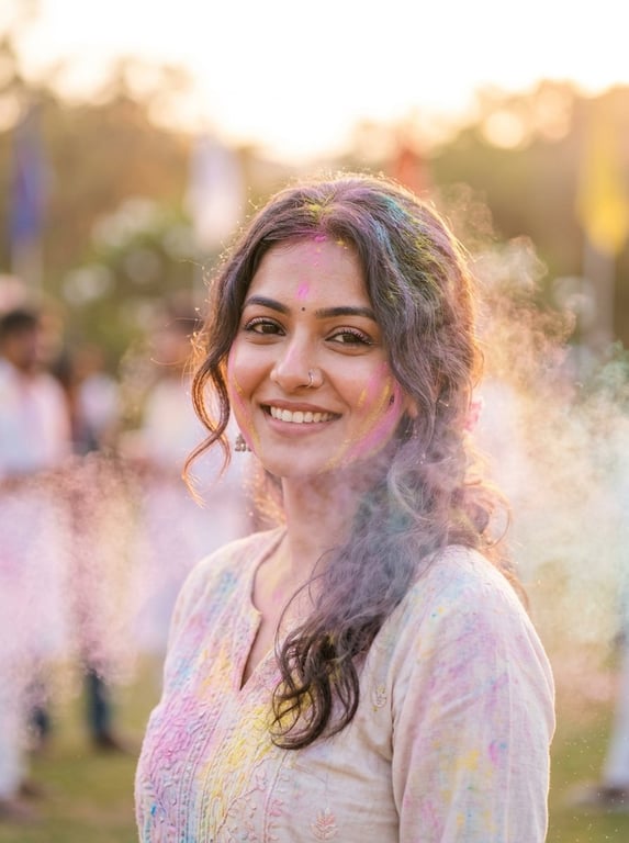A prompt for generating a soft, dreamy aesthetic portrait of a person celebrating Holi, focusing on pastel powder floating like mist, golden hour lighting, and ultra-detailed skin texture.