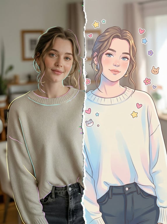 A prompt to create an ultra-detailed, 8K split-style portrait where the subject is vertically divided into two contrasting halves: one side a realistic photo with neon outlines, and the other a clean digital illustration (chibi or semi-realistic style) with decorative stickers, while maintaining an identical background across both halves.