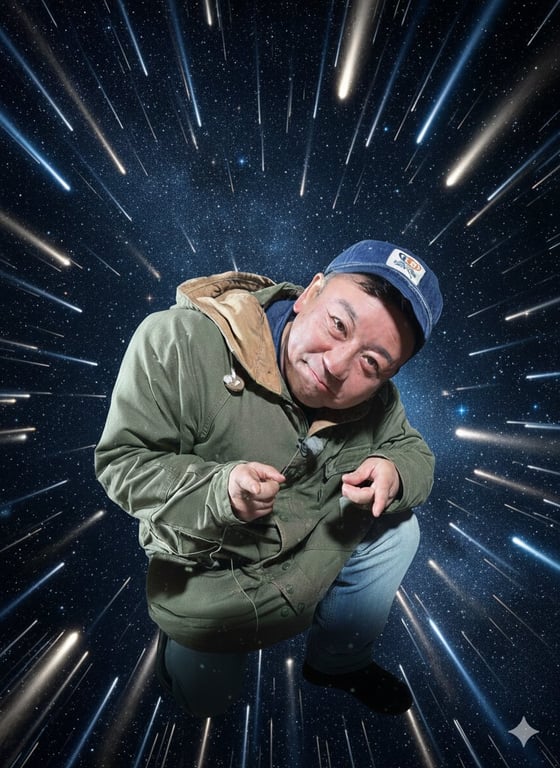 A sequence of modification prompts for Nano Banana Pro (Gemini 3 Pro Image) to transform an existing image. The user first attempts to remove a crab and place the person smaller in the center in a Star Wars SF style, then tries adding a thick blue glowing circular radiation line, and finally removes the radiation line and adds many shooting stars.