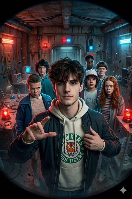 A prompt for generating an ultra-realistic, intense close-up selfie of a man in a Stranger Things-themed bunker, surrounded by the main cast. It specifies a bold action pose, retro Hawkins High attire, and dramatic blue-red lighting with strong fish-eye distortion to enhance realism and depth.