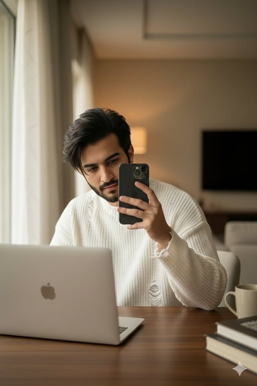 A highly detailed, structured JSON prompt for Gemini Nano Banana Pro, designed to generate a realistic, candid indoor photograph of a young man with specific styling, clothing (white distressed knit sweater), and lighting conditions, emphasizing realism and trendy aesthetics.